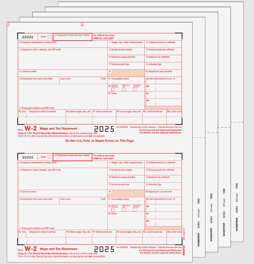 Description: This 8-part traditional 2 Up blank laser set includes one preprinted employer W-2 copy A (red scannable) and four blank 2-up laser sheets for: